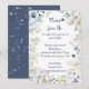 Modern Christmas party invitation featuring winter flowers in white, cream, dusty blue, and sage green. The text is a handwritten calligraphy font in dusty blue. The back of the card is dusty blue with snowflakes. Personalise with your own information.