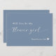 The card prominently features the phrase "Will You Be My Flower Girl," often presented in a flowing white script font that adds a touch of romantic elegance. The elegant dusty blue background provides a serene and sophisticated backdrop, allowing the white script to stand out. The card is often personalised with the bride's name, adding a special touch. The inside of the card is typically left blank, allowing for a handwritten message that expresses the bride's personal connection and excitement. The overall design is intended to be visually appealing and cohesive with a modern or elegant wedding theme.