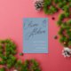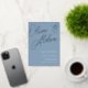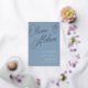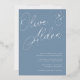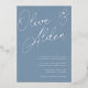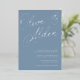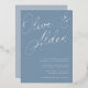A beautiful typography based wedding invitation featuring your names in oversized silver foil script lettering at the top. Personalise with your wedding details in classic serif lettering aligned at the lower right. Our Dusty Blue colorway is an elegant mix of ethereal blues, with white and blue-grey lettering on a dusty medium blue background.