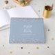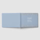 This elegant wedding guest book features top and bottom borders of faux silver glitter on a dusty blue background. Easily customise the white text with the names of the bride and groom in whimsical handwriting calligraphy over a large, pale blue ampersand. Add additional text of your choice to the front and spine.