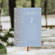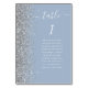 The left-hand edge of this elegant modern wedding table number card features a silver faux glitter border. The word "table" appears in white whimsical handwriting script on a dusty blue background. Add the names of your guests who are assigned to each table.