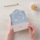 All in one wedding invitation featuring pretty string lights, hand-drawn floral garland and chic typography on a dusty blue background. The invitation includes a perforated RSVP card with your wedding website QR code and details. Designed by Thisisnotme©