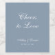 A simple, minimalist dusty blue wedding design with elegant calligraphy. The words "Cheers to Love" and the names of the bride and groom are written in an elegant calligraphic script. The wedding date is written under the names in small caps. The text is white, the background is dusty blue.