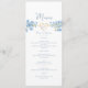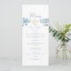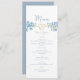 Elegant, modern calligraphy script, elegant dusty blue wedding menu with gold rope heart, periwinkle wildflowers, monogram and simple calligraphy script.