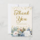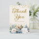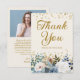 Elegant dusty blue and white roses, floral, and greenery women's birthday party "Thank you" card with gold glitter. This card is printed on the front and back and personalised with her name, age, and photo. Contact me for assistance with your customisations or to request additional matching or coordinating Zazzle products for your party.