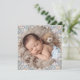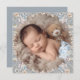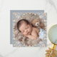 Featuring a beautiful watercolor floral wreath that encircles your baby's photo, this card is set against a trendy, soft dusty blue background.
