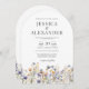 This Dusty Blue Wildflowers Elegant Arch Wedding Invitation showcases delicate watercolor wildflowers in shades of dusty blue, purple and yellow on a white background, complemented by contemporary typography in grey. It is fully customisable with the couple's names, wedding details and wedding website, with the couple's names and optional additional information on the back. The formal design and wording will add a touch of elegance to your wedding celebration.
