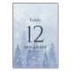 This table number card has a romantic dusty blue winter scene of fading pine trees and white snowflakes. Also available are the matching menu, napkins and stickers. This is part of a complete wedding suite. You can click the customise option to select all the table numbers that you will be needing.