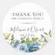 Chic dusty blue and yellow watercolor flowers with delicate green botanical branches, personalised wedding favour sticker.