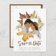 Dusty Brown Autumn Leaves Elegant Rustic Fall Wedding Save the Date Postcard. Pretty, elegant and modern wedding invitations for your special occasion! Perfect for the beautiful and calming autumn fall season! Watercolor dark light brown and golden yellow autumn leaf foliage square border with a variety of maple leaf, oak leaf and dried flowers frames the top of your wedding celebration details. Your names are featured in modern font at the top, and reverse card to reveal a dark brown pattern background at the back. Customise your wedding details, date, venue and more at the front.
