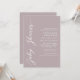 Invite friends and family to celebrate a special baby shower with this elegant dusty lavender invitation. Featuring a minimalist design with modern script and delicate typography, this invitation is perfect for creating a sophisticated and welcoming atmosphere. The soft colour and clean lines add a touch of grace and simplicity, making it ideal for such a joyful occasion. Customise the details to create a unique and memorable invitation for your baby shower celebration.
