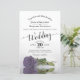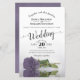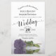 This beautiful budget or affordable wedding invitation features a romantic design with a single long-stemmed lilac, lavender, or dusty purple coloured rose laying on its side and reflecting in a pool of water. The typography features lacy script calligraphy and a sophisticated layout. The back is a deep marbled violet or purple colour. Wonderful way to invite your friends and family to share in your joy on your special day.