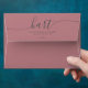 Add timeless elegance to your mail with this dusty rose return address envelope, featuring a flowing black script surname and classic serif typography. Centred on the envelope flap, this minimalist yet romantic design is perfect for weddings, bridal showers, thank-you cards, or sophisticated everyday correspondence. The contrast of soft pink and rich black creates a polished, stylish finish your recipients won’t forget.