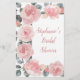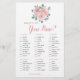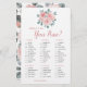 This bridal shower game card is What's in your purse? The design features watercolor dusty rose flowers and eucalyptus leaves. Personalise the back of the cards with the bride's name. Matching products available.