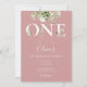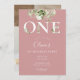 A pretty first 1st birthday photo invitation featuring watercolor floral greenery on a dusty rose pink background and a special photo on the reverse. Designed by Thisisnotme©