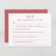 The front of this stylish RSVP card features elegant lettering in dusty rose pink and has space for guest acceptance responses along with meal choice and song preference. The back of the card is plain dusty rose pink to match the colour of the text on the front. Please personalise the Respond-By date (and any other text you may wish to personalise) using the online personalisation template before ordering. If you wish to make advanced adjustments after personalising the text, please click on "Edit using Design Tool" to "customise further" before ordering.