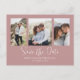 An elegant simple modern photo collage modern dusty rose save the date with a QR code website online information, a three 3 photo simple elegant layout, and a multi-photo couple engagement picture template, for a wedding modern simple photo collage, an engagement photos budget postcard, with calligraphy brush script text font, and website information online more info, and typography modern brush script, a budget-friendly save the date