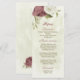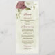 Beautiful romantic wedding menu card featuring dusty rose and white flowers and some pretty leaves .
