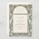 A luxurious save the date card featuring intricate Art Nouveau floral frames in soft gold against a deep green backdrop. Embellished with delicate vines, blossoms, and vintage detailing, this card sets the tone for a timeless and romantic wedding celebration with classic style and sophistication.