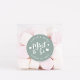 Punny wedding favour stickers feature "mint to be" in white hand lettered script accented with hearts, on a dusty sage green background. Personalise with your names and wedding date.