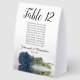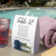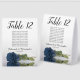 These tent table number signs are not only beautiful, they even include a list of names for the guests at each table, making it easy for your guests to find their seat at your wedding reception. The design is both elegant and romantic featuring a single dusty steel blue coloured rose lying on its side reflecting in water with waves and ripples. The title is in lacy script calligraphy with bold numbers so your guests can easily find the right table. There is room for the names of the couple and the wedding date.