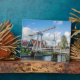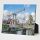 Painting of the street and traditional Dutch lifting wooden bridge in fishing village in Volendam, North Holland, Netherlands.