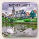 Painting of traditional wooden fishing houses, canal and swan in Marken, Netherlands. View of canal, bridge and traditional fishing houses in waterland village. Traditional Holland symbols.