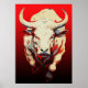 The fiery red tones that dominate the background evoke a sense of passion, energy, and movement, emphasising the bull's dynamic nature. The play of light and shadow adds depth and dimension, making the image come alive. The bold strokes and fiery palette create an artwork that is both modern and timeless, appealing to those who appreciate strength, motion, and dramatic compositions.