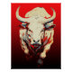 The fiery red tones that dominate the background evoke a sense of passion, energy, and movement, emphasising the bull's dynamic nature. The play of light and shadow adds depth and dimension, making the image come alive. The bold strokes and fiery palette create an artwork that is both modern and timeless, appealing to those who appreciate strength, motion, and dramatic compositions.