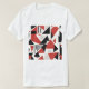 A bold composition of red, black, and white geometric shapes, including triangles, rectangles, and lines, forming a modern abstract design.