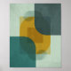 A modern, abstract geometric poster design featuring overlapping translucent shapes. The composition is divided into four quadrants with textured, muted background colors (soft teal, light sage, dark charcoal/slate). Central to the design are a large, vibrant mustard yellow curved shape and several partially visible, translucent teal/grey circles and rectangles. The artwork is characterized by its sharp lines, clean edges, and contemporary color palette, creating a sense of depth and dynamic movement through the interplay of transparency and opaque forms.