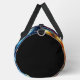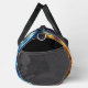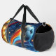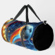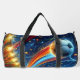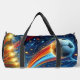 This duffle bag features a vibrant and dynamic design centred around a soccer ball in motion. The background is a rich dark blue, from which emanate streaks of glowing light in fiery oranges, reds, and bright blues, suggesting speed and energy. Stars and abstract light trails further enhance the sense of movement and excitement. The soccer ball itself is depicted with realistic shading, appearing to be in mid-flight or at the centre of this energetic display. The bag has practical black handles and a mesh side pocket.