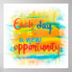 This design features the quote "Each day is a new opportunity" written in a red, blue, orange and red hand lettered calligraphy script font on an abstract artistic background.