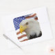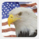An image of the head of a bald eagle over an American flag waving in a breeze.