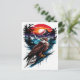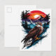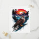 Digital illustration of a red-tailed hawk perched on a blue splattered rock. The hawk has detailed brown and white feathers, yellow talons, and a sharp yellow beak. Behind it, a vibrant sunset with a red-orange sky, silhouetted pine trees, and snow-capped mountains. The background features dynamic brush strokes and splatters, blending realism with abstract art styles. The overall color palette includes rich browns, whites, blues, and reds.