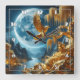 A majestic golden eagle rests on a tree branch, surrounded by shimmering golden landscapes and a glowing full moon above a serene river at night.