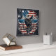 A majestic eagle stands on a tree branch, set against a background featuring mountains and the American flag.