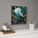 An eagle stands majestically on a branch, illuminated by the glow of a full moon, surrounded by lush trees and rocky landscapes.