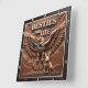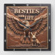 This highly dimensional square wall clock features a unique illustration of a brown eagle and a white, smiling rabbit sitting closely together. The entire design is rendered in muted brown, tan, and dark leather-like tones, strongly suggesting a deep sculpted relief or Sculpted Leather Look. The eagle is perched on the left, displaying detailed feathers and a yellow beak, while the rabbit is on the right, appearing cheerful with long ears and textured fur. They are framed by a prominent, circular wreath of gnarled, dark tree roots and stylized leaves carved into the perimeter. The background is a dark, heavily textured leather panel. The large, three-dimensional embossed text "BESTIES FOR LIFE" is carved across the top center in a bold, golden serif font. The clock face features a simple clock face border with large, white, numbered tick marks (1 to 12) integrated into the outer frame. The artwork is surrounded by a thick, dark brown decorative border that resembles a black wood frame.