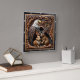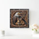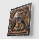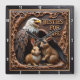 This highly dimensional square wall clock features a close-up illustration of a brown eagle with a determined expression and a white, smiling rabbit sitting closely together. The entire design is rendered in muted brown, tan, and dark leather-like tones, strongly suggesting a deep sculpted relief or Sculpted Leather Look. The eagle is perched on the left, displaying detailed feathers, while the rabbit is on the right, appearing cheerful with long ears and textured fur. They are framed by a prominent, circular wreath of stylized leaves and branches carved into the perimeter. The background features detailed rocky terrain and stylized trees. The large, three-dimensional embossed text "BESTIES FOR LIFE" is carved across the top center in a bold, golden serif font. The clock face features a simple clock face border with large, white, numbered tick marks (1 to 12) integrated into the outer frame. The artwork is surrounded by a thick, dark brown decorative border that resembles a black wood frame.