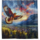 A beautiful eagle soars above a still sleepy town as the suns comes up over the mountain.