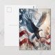 An eagle flies through the air, its wings spread wide against a backdrop of the American flag.