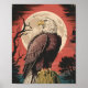 This design features a majestic eagle perched on a tree stump, with a full moon background in a crepuscular sky.