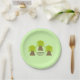 This awesome paper party plate features a graphic image of three trees that resemble palm trees with large green leafy fronds and a sturdy brown tree trunk. There is a message in brown text to look like soil under the trees. The message says Happy Earth Day.