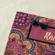 This beach towel is primarily earth tone colours from tan to red and brown, but also has small amounts of royal blue, pink and deep plum. At the top is a panel for you to personalise it with your name.