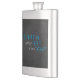 The product is a good size and came exactly as it was pictured. The lid is not attached to the flask, which could be dangerous on drunken nights... The print came out surprisingly well and looks very sharp. Would definitely recommend.