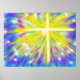 Modern Easter abstract resurrection cross watercolor art. This bright and vibrant cross design celebrates Jesus resurrection. The golden yellow cross creates a vibrant starburst of bright colors on a blue, purple and mauve background. Christian religious contemporary original artwork by artist Catherine Sweetman