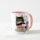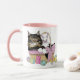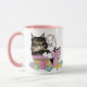 Cute tabby long hair kitten sitting in an Easter Basket with a pink bow and a stuffed Easter Bunny. Easter Eggs all around the basket.