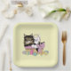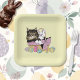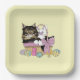 Cute Tabby long haired kitten sitting in an Easter basket with a pink bow and a white stuffed easter bunny. Easter eggs all around the Easter basket.