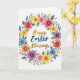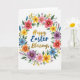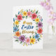 At the center of the card is a round floral wreath on a white background, circling a friendly Easter greeting that feels like it’s meant to be shared between close friends. The main text sits neatly in the middle, with “Happy” and “Blessings” in warm golden lettering and “Easter” in a deep blue that stands out clearly. Around the words, layered blossoms in pink, red, yellow, blue, purple, and orange lean toward one another like a gentle bouquet exchange 🌷. Small green leaves weave between the flowers, adding a soft, fresh spring look without crowding the message. Tiny yellow star-shaped florets and scattered dots in matching tones fill the gaps, giving the wreath a light, confetti-like sparkle 🐰. The circular layout pulls your eyes inward, as if drawing two people closer to read the message together. The wreath’s petals are subtly shaded, and the golden and blue text sits centered within the ring of flowers.